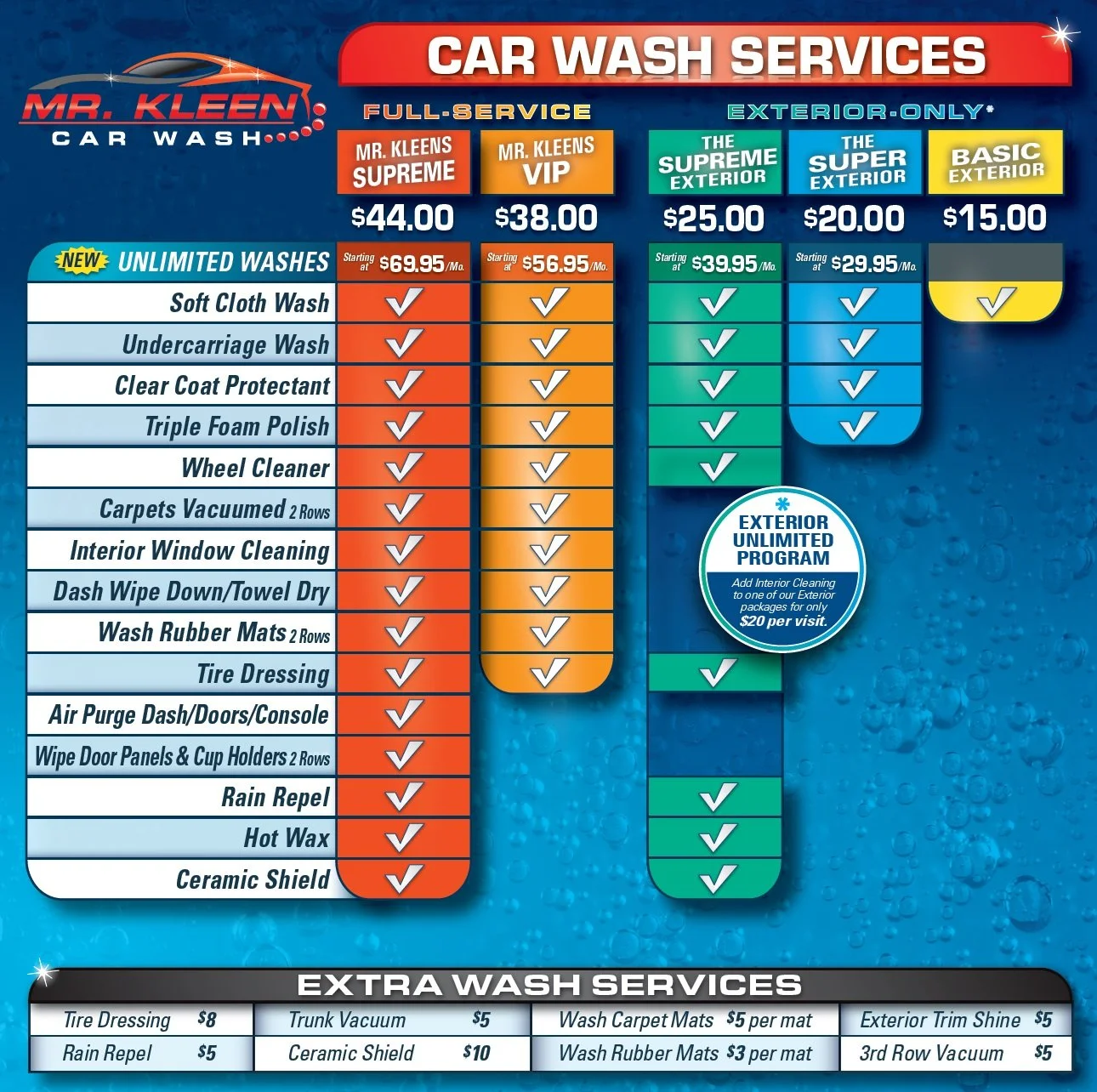 Membership is per vehicle for an indefinite duration and for personal use only; taxis, limos, and other professional vehicles are prohibited. Membership is not valid for vehicles that cannot fit on the conveyor or ride through the tunnel. Unlimited plans are valid only at Mr Kleen Car Wash - Alexandria, VA, once per day that Mr Kleen Car Wash - Alexandria, VA is open. Mr Kleen Car Wash - Alexandria, VA may be closed occasionally due to maintenance service or inclement weather. No refunds or credits will be given for partial months. The Unlimited Wash Plans are month-to-month, there are no long-term commitments and no hidden cancellation charges. This program cannot be combined with any other offers or discounts. Membership fees will be automatically billed to your credit card on the day corresponding to the commencement date for the agreed plan. Membership automatically renews monthly unless canceled by the customer in writing at least 7 days prior to the billing date and after the first full month.